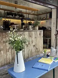 The cafe itself is located inside of four kiosks on the towpath between Whitmore Road and Kingsland High Street in De Beauvoir Town. In 2010, the cafe started out as three shallow units, but has since expanded.[1] Each kiosk serves as a different section of the cafe: kitchen, bar, seating, and larder.[2] Weather permitting, there is additional outdoor seating available.