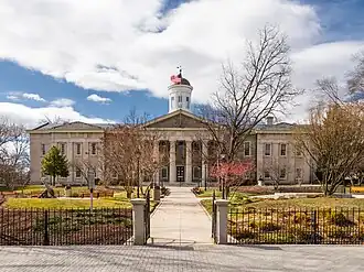 The Baltimore County Courthouse, still in use by 2015, with its various annexes (and the separate county courts and administrative building), was originally designed by the local city architectural firm of Dixon, Balbirnie and Dixon.[16] It was completed within a year, constructed of limestone and marble donated by the well-known Ridgely family of nearby Hampton Mansion, on land donated by Towson doctor Grafton Marsh Bosley.[9][12][15] The courthouse was subsequently enlarged in 1910 through additional designs for north and south wings by well-known and regarded city architects, Baldwin & Pennington. Additional expansions later in 1926 and 1958 eventually created an H-shaped plan for the courthouse. An additional modernistic Baltimore County Courts Building, with room for the new charter government since 1956 and administration of a county executive and county council, plus administrative and executive departments, was erected in 1970–71 across a plaza to the west of the older historic courthouse.[17]