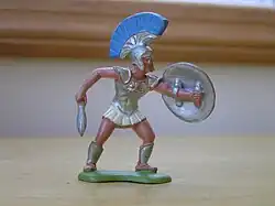 In addition to Britains, there have been many other manufacturers of toy soldiers over the years. For example, John Hill & Company produced hollow cast lead figures in the same style and scale. Companies such as Elastolin and Lineol were well known for their composite figures made of glue and sawdust that included both military and civilian subjects. After 1950, rising production costs and the development of plastic meant that many shop keepers liked the lighter, cheaper, and far less prone to break in transit polythene figure. This led to greater demand for plastic toy soldiers.[2] The first American plastic soldiers were made by Beton as early as 1937. The first plastic toy soldiers produced in Great Britain were made in 1946 by Airfix before they became known for their famous model kits range.