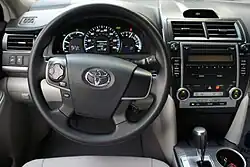 The XV50 Camry was introduced on 23 August 2011 and made its debut in the 2011 NASCAR Sprint Cup Series on 27 August 2011. It was released in Japan on 5 September 2011 and in the U.S. later that same month.[9] The interior received a major restyling, while the exterior received all-new sheet metal and more angular styling. Power options are the 2.5-litre 2AR-FE 4-cylinder and the 3.5-litre 2GR-FE V6. The power output for the 2AR-FE was increased to 133 kW (178 hp) across the entire vehicle lineup while the power output for the V6 remained unchanged. EPA fuel economy numbers for both engines increased, with the V6 engine increased to 11 L/100 km; 25 mpg‑imp (21 mpg‑US) city cycle, 8 L/100 km; 36 mpg‑imp (30 mpg‑US) highway cycle and the 4-cylinder having 9 L/100 km; 30 mpg‑imp (25 mpg‑US) city cycle and 7 L/100 km; 42 mpg‑imp (35 mpg‑US) highway cycle.[10] The engine produces 230 N⋅m (170 lbf⋅ft) of torque. Despite similar exterior dimensions with the XV40 Camry, Toyota was able to increase the interior volume by restyling the interior panels so that they followed the contour of the exterior panels.