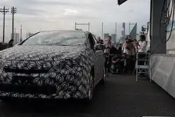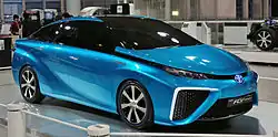 The Mirai is based on the Toyota FCV-R (Fuel Cell Vehicle) concept car, which was unveiled at the 2011 Tokyo Motor Show[17][18] and the Toyota FCV (Fuel Cell Vehicle) concept car, which was unveiled at the 2013 Tokyo Motor Show.[19] The unveiled FCV concept was a bright blue sedan shaped like a drop of water "to emphasize that water is the only substance that hydrogen-powered cars emit from their tailpipes." The FCV has a large grille and other openings to allow cooling air and oxygen intake for use by the fuel cell. According to Toyota, the FCV concept is close in appearance to the expected production version of the car.[20] The FCV size is similar to the Camry.[21] The FCV range is expected to be approximately 700 km (430 mi) under Japan's JC08 test cycle.[22]