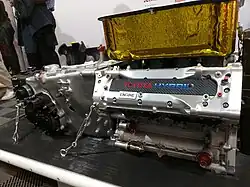 The TS040 Hybrid also uses mid-mounted, naturally-aspirated petrol V8 engine, angled at 90 degrees,[18][19] was carried over from the TS030 Hybrid.[20] Its displacement, increased from 3.4 L (210 cu in) to 3.7 L (230 cu in) by lengthening the stroke for better efficiency,[20][21] supplies 520 PS (382 kW; 513 hp) to the rear wheels, which combines with the electric motor to produce 1,000 PS (735 kW; 986 hp).[2][22] The engine was developed to run with a fuel flow metre promoting a concept switch to efficiency from power.[21] The bosses-mounted injection system were in the inlet tract and placed over the angled throttle valves relative to the inlet path. They were fitted with eight solenoid injectors which sent power each of the throttle runners and into the inlet portlets. Toyota installed two systems featuring knock control to detect vibration and real-time combustion pressure sensors to tune the spark timing among other engine components during a race for reliability purposes.[23]