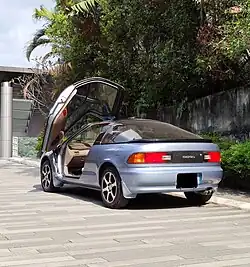 The Toyota Sera is a 3-door hatchback coupe of monocoque steel construction. The Sera's butterfly doors are hinged at the top center of the windscreen, and bottom of the A pillar and open forward and up in a manner similar to the McLaren F1 and Saleen S7 - the McLaren F1 designer Gordon Murray cited the Sera as the inspiration of the F1's door arrangement.[3] The weight of each door is primarily supported by a thick gas strut and counterbalanced by a smaller secondary strut inside the door.