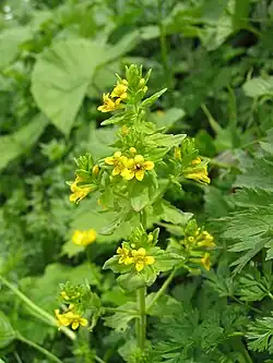 Tozzia alpina is a herbaceous, perennial plant, reaching heights of 10 to 50 centimetres (3.9 to 19.7 in). The quadrangular stem is hairless in the lower part, hairy on the edges in the middle and upper part.[3] The simple, bright green leaves are broad, ovate, serrate, with a length of 1 to 3.5 centimeters, a rounded or slightly heart-shaped basis, and a sharp upper end.[3]