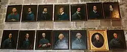 On the cathedral wall under the Hastings tower are oil paintings of the 14 Tréguier bishops from 1587 to 1801 when the Tréguier bishopric was merged with that of Saint Brieuc.[6]