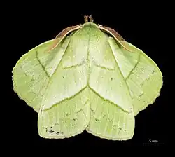 The wingspan is about 67 mm for females and 47 for males. The body colour of the male is apple green. Antennae ochreous brown. The disk of the forewing and the inner margin of the hindwing are whitish. Forewings with a faint pale antemedial line curved below the costa. There is a dark speck at end of cell, and a pale straight oblique postmedial line which becomes medial on the hindwing. Both wings have a series of small submarginal dark spots. The female is yellowish green, which fades to ochreous. Lines and spots of both wings are enlarged and blackish. The spot at the end of the cell of the forewing is large, conspicuous and irrorated (sprinkled) with black scales, and sometimes centered with grey. A reddish-brown patch thickly irrorated with black occupying whole medial inner area from median nervure to inner margin. Cilia of wings are blackish.[4]