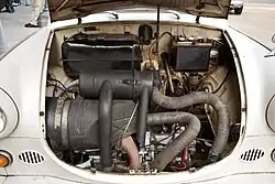 VEB Sachsenring Automobilwerke Zwickau installed a VEB Barkas-Werke-made P 60-series engine in the Trabant 600. It is similar in design to the P 50 engine used in the Trabant P 50; it is an air-cooled, two-cylinder, two-stroke petrol engine with a rotary intake valve, cross-flow scavenging, a simple crankshaft, and a horizontal draught carburettor. The biggest difference between a P 50 and a P 60 engine is that the latter has conrods with needle bearings. The P 60's engine block is made of grey cast iron with cast-on aluminium cooling fins. The bore is 72 mm with a piston stroke of 73 mm. The engine has a compression of ε=7.6 and runs on petrol with a research octane number of 78. For engine cooling, the P 60 series engine is fitted with a belt-driven fan.[2] With a P 60 series engine, a Trabant can reach a top speed of around 100 km/h, with a fuel consumption of approximately 8.5 L/100 km;[4] the rated fuel consumption (DIN 70030) is 6.8 L/100 km.