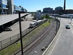 In 1920, the War Department bought much of the Commonwealth Flats to construct the South Boston Army Base and South Boston Naval Annex.[9] Tracks were extended through the Waterfront district to the new bases, with the Army Yard located at Summer and D Streets. The West First Street Yard was constructed to serve the variety of industries in the area. A spur was built down East 1st Street to additional Army facilities and the Boston Elevated Railway's South Boston Power Plant, overlapping the eastbound streetcar track on the street. On March 5, 1942, BERy abandoned the streetcar tracks by request of the War Department, to avoid possible collisions between streetcars and freight trains carrying petroleum and ammunition.[10]