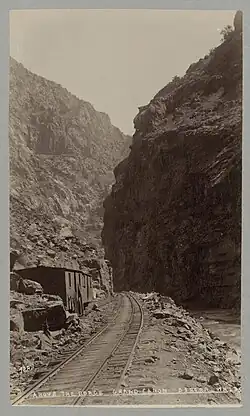 As the national rail network matured, railroaders sought cheaper methods of construction in order to supply more locations with rail transport. Some narrow-gauge coal railways opened in the late 1860s,[45] but the Denver and Rio Grande Railway, opened in 1871, was the first to explicitly base its design on new theories of lighter construction, including utilizing a 3 ft (914 mm) gauge.[46] This would go on to become the most established gauge among narrow gauge routes, with over 95% of peak track mileage built to this width.[47] Early ambitions of these new railroads were to eventually connect to form their own comprehensive network and obviate the need to interchange freight with the established standard gauge system,[48] though this would not come to fruition and the narrow gauge railroads served as a series of several regional railroads. Promoters would refer to the Denver and Rio Grande as an example of the efficacy of the principle.[49][50] The sudden proliferation of these beliefs were somewhat derisively referred to at the time as "narrow gauge fever".[51][52] By 1876, narrow gauge construction construction in the United States comprised 35% of all rail construction, though the weak economy of that decade led to lower construction quality for new railroads.[53] The failure of the Grand Narrow Gauge Trunk in the mid-1880s was seen as proof that narrow gauge railroad practices were not suitable for competing with standard gauge roads.[54] Mileage of narrow gauge peaked in 1887 with 11,699 miles (18,828 km) in service. Conversion to standard gauge was much slower than the South's efforts in eliminating their broad gauge, with 7,000 miles (11,000 km) of narrow track in operation in 1902 and 2,000 miles (3,200 km) still operating in 1937. By 2009, only 46 miles (74 km) of common carrier railroad utilized a narrow gauge, with about 2⁄3 of all narrow gauge line in the United States having been converted to standard and the rest abandoned. Several tourist railroads continued to utilize narrow gauges.[55]