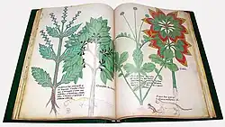 The Egerton manuscript, the earliest version and acquired by the British Museum in 1839, is incomplete.[7] The Sloane manuscript is a volume with 109 folios of large parchment, (365 mm x 265 mm) It is illustrated with nearly 500 polychrome representations of plants, animals and minerals, which were all used as primary materials to produce drugs.