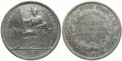 To control the money supply in French Indochina in 1885, the French introduced a new silver Piastre de commerce and associated subsidiary coinage throughout the entire Indo-Chinese colonies in order to increase monetary stability. The piastre was initially equivalent to the Mexican peso. The piastre was therefore a direct lineal descendant of the Spanish pieces of eight that had been brought to the Orient from Mexico on the Manila Galleons. It was initially on a silver standard of 1 piastre = 24.4935 grams pure silver. This was reduced to 24.3 grams in 1895.