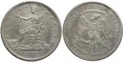 The United States trade dollar is a silver (fineness of .900 or 90%) dollar coin that was issued by the United States Mint and minted in Philadelphia, Pennsylvania, Carson City, and San Francisco from 1873 to 1885. Business strike trade dollars were last produced in 1878 and proof coin production continued until 1885.[5] The coin weighs 420 grains (7/8 of a troy ounce) (27.2 g), about 8 grains (0.52 g) more than the domestic silver dollar (Seated Liberty Dollars and Morgan Dollars) of the time. It is 4 grains heavier than the Mexican peso; however, the peso is .903 silver.[6]