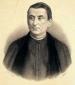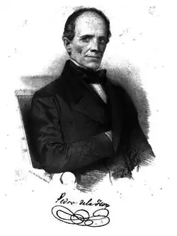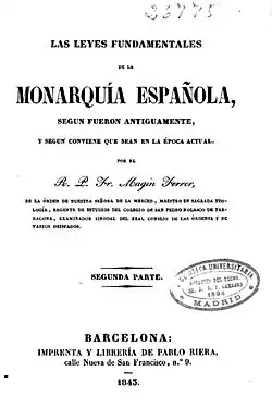 The Carlist version of Traditionalism was developed mostly by vast array of periodicals, headed by La Esperanza and its chief, Pedro de la Hoz.[43] The first complete Carlist lecture of Traditionalism – by some considered the first complete lecture of Traditionalism at all, preceding those of Balmes and Donoso – is supposed to be the 1843 work of Magín Ferrer.[44] Other authors who ventured to offer a more systematic lecture, like Vicente Pou,[45] did not make a major impact.[46] Discussing ongoing politics Carlist Traditionalism focused on negative points of reference,[47] opposing Liberalism and its incarnations like constitutionalism, electoral system, ongoing secularization of state, desamortización and centralization.[48] Concepts attributed to the claimants and named minimalismo and montemolinismo are political strategies rather than theories;[49] the most lasting contribution to Carlist Traditionalism of the era was a so-called double legitimacy theory.[50]