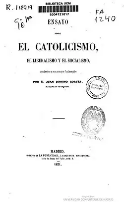 - ^ full title Ensayo sobre el catolicismo, el liberalismo y el socialismo, considerado en sus principios fundamentales