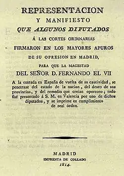 - ^ Manifiesto de los Persas is the reference commonly used in literature. The original title of the document was Representación y manifiesto que algunos diputados a las Cortes ordinarias firmaron en los mayores apuros de su opresión en Madrid