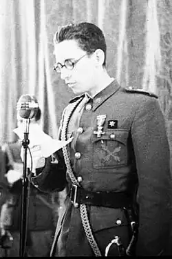 As new lines of the European conflict were getting increasingly clear more and more Carlists began to look to Germany; its dynamic growth to power and its regime were perceived as counter-proposal to rotten, liberalism-driven, decadent French-British alliance.[310] During the First World War most Carlists sympathised with the German Empire,[311] though a sizeable minority section – including the claimant – supported France.[312] The split contributed to major crisis within the movement and its breakup in 1919.[313] In the interwar period Traditionalist press looked with hope towards emerging anti-democratic regimes, especially these of Portugal and Italy, though also in Austria and Germany. Some tentative credit given to Hitler was withdrawn following the Dolfuss assassination, but Mussolini was still viewed as an ally; in the mid-1930s some 200 Carlists received military training in Fascist Italy[314] and the Comunión political leader Rodezno signed a related quasi-political agreement.[315] During the Second World War there were both pro-Axis[316] and pro-Allies[317] currents within the organisation; eventually the non-engagement policy was enforced,[318] even though the regent-claimant was loosely involved in Resistance and he ended up in the Nazi concentration camp.[319]