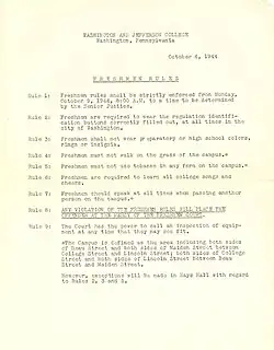 One of the oldest traditions at Washington & Jefferson College were the "Freshman Rules," a system of rules and restrictions on freshmen. By tradition, the rules were to "make the frosh feel at home."[10] Of all the rules, the sock inspection inspired the most fear, as upperclassmen were able to inspect the color and type of socks worn by any freshman at any time.[10] Punishments for failing to wear Freshman Rules-compliant socks ranged from paddling to being drenched in the gym showers. The sock inspections often turned into a gang fight, with freshman defending their compatriot against upperclassmen.[10]