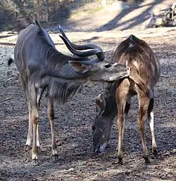 Given the various species of spiral-horned antelope the social organization varies between. The extreme ends of the spectrum are the predominately solitary bushbuck and at the other end the highly social giant eland.[26] In general the herd size of spiral-horned antelopes are not large as they rarely exceed more than a few dozen individuals, and are mostly sedentary in nature.[26][1] The herd composition is unisexual which is mostly females and their young. It is currently believed to be the reason why some spiral-horned antelopes practicing herd as a defense mechanism to protect the young from predators.[26][1] In the bongo and eland species this led to the development of larger sizes in the females and horns, along with intense social hierarchical ranking (which is not seen in other species which it is only the larger males that dominate over the smaller females).[26][1] With the exception of the mother and her calf there are no strong social bonds in the herd.[26][1][4] These herds are sometimes very open and loosely defined as sometimes females come and go.[26] Males born in the herd will remain in the herd until they developed their primary and secondary sexual characteristics.[26][4] Once they have developed these traits males leave the herd and become nomads.