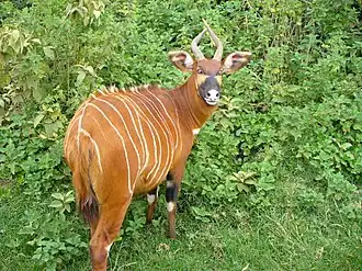 Tragelaphus is a genus of medium-to-large-sized spiral-horned antelopes. It contains several species of bovines, all of which are relatively antelope-like. Species in this genus tend to be large in size and lightly built, and have long necks and considerable sexual dimorphism. Elands, including the common eland (Taurotragus oryx), are embedded within this genus, meaning that Taurotragus must be subsumed into Tragelaphus to avoid paraphyly. Alternatively, Taurotragus could be maintained as a separate genus, if the nyala and the lesser kudu are relocated to their own monospecific genera, respectively Nyala and Ammelaphus. Strepsiceros is a generic synonym.[2] Genus Boocercus formerly contained T. eurycerus.[3] The name "Tragelaphus" comes from the mythical tragelaph.