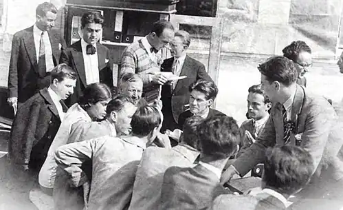 In 1933, shortly after the Nazi seizure of power, Herseni visited Berlin, befriending there the anti-Nazi Romanian Petre Pandrea.[27] He took his Ph.D. in 1934, with the dissertation paper Realitatea socială ("Social Reality"), an "essay in regional onthology". It earned praise from Gusti, who called Herseni "one of the most gifted and educated [youths] of today's generation", one promising to "enrich Romanian sociology and philosophy with very valuable works."[4] Stahl recalls that only Herseni could match his teacher's "surprisingly vast erudition" and "systematization" of received knowledge; he was also among the more loyal of Gusti's gifted disciples, effectively replacing Petre Andrei, who had spoken out against the ISR.[28] Herseni was an enthusiastic promoter of sociological campaigns, famous as the ISR's "polygraph" and as Gusti's most orthodox interpreter.[29]