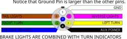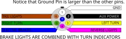 This contact is less common, and may have completely different wiring than that shown here. The wiring is same as for the 6-pin round connector with center pin (Reversing lamps) excluded.