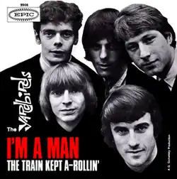 English rock group the Yardbirds recorded "The Train Kept A-Rollin'" during their first American tour in 1965. It is based on Johnny Burnette's adaptation, but Beck biographer Annette Carson comments their "propulsive, power-driven version, however, deviated radically from the original ... [their] recording plucked the old Rock & Roll Trio number from obscurity and turned it into a classic among classics".[21] The Yardbirds' lead guitarist Jeff Beck, who is a fan of early rockabilly, said that he introduced the song to the group: "They just heard me play the riff, and they loved it and made up their version of it".[15] Giorgio Gomelsky, the group' first producer, states that Sonny Boy Williamson II's use of blues harp to imitate train sounds during his 1963 UK tour with the Yardbirds also inspired the band's adaptation of the song.[22][c]