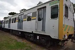Railways experienced increased patronage into the 1940s, but railway improvements recommended in the Ashworth Improvement Plan were delayed until after World War II.[45] It was not until 1950 that the Victorian Railways were able to put their Operation Phoenix rebuilding plan into action.[46] The delivery of the Harris trains, the first steel suburban trains on the network, enabled the retirement of the oldest of the Swing Door trains.[47]
