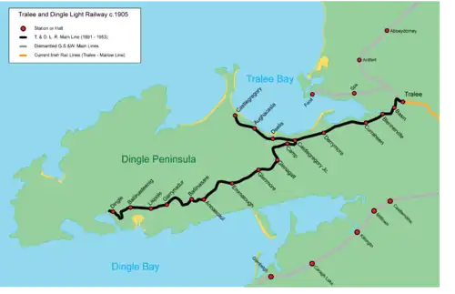 The Tralee and Dingle Light Railway and Tramway was a 51 km (32 mi), 914 mm (3 ft) narrow gauge railway running between Tralee and Dingle, with a 10 km (6.2 mi) branch from Castlegregory Junction to Castlegregory, in County Kerry on the west coast of Ireland. It operated between 1891 and 1953; the Castlegregory branch closed shortly prior to the outbreak of the Second World War. It was one of the most westerly railway lines in Europe, but the terminus of the Valentia Harbour branch at 10.277785° was further west.
