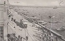 The first tram line in İzmir opened in 1890, between Alsancak Terminal and Pasaport pier, along the Kordon (esplanade), to transport freight.[2] This line also saw horse-drawn trams carry railway passengers from Pasaport (near the city center), to Alsancak station. In 1901, this line was extended to the newly built İzmir Clock Tower in Konak (the city center). The second line to open was in Karşıyaka, in 1906, from the Karşıyaka pier to the Karşıyaka railway station. In 1907, two more lines were completed in Karşıyaka: Karşıyaka pier-Alaybey and Karşıyaka pier-Bostanlı.[4]