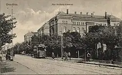 In 1897, the Grudziądz tramway was bought by the owner of the power plant in Grudziądz, "Nordische Elektrizitäts-Gesellschaft in Danzig", which aimed to electrify the horse tram. A new company was created, and work began with the reconstruction of the power plant. At the same time, the original horse tram route was extended by 0.7 km in ul. Legions to Tarpno. Due to the tight course of the old city, most of the sections were single track, with occasional double track sections at stations for passing. The official opening of the electric tram line took place on 12 May 1899. The route was operated by 6 motor cars, while horse-drawn tram trucks were converted into trailer wagons. In 1900, the city authorities bought the power plant and the tram line. The company “Städtische Elektrizitätswerk und Straßenbahn Graudenz”. In 1911, a second 1.6 km long tram line was built and launched. The route ran from the Grain Market Square (current al. 23 January) through Toruńska and Chełmno streets to the intersection with Bydgoska Street. Two years later, it was extended by 0.5 km to the south. The outbreak of World War I resulted in the suspension of operation on the line, as it was modified to carry wounded soldiers away from the front and to transfer weapons from the manufactories to the train station.