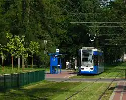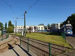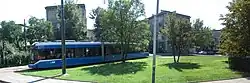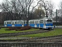 The fleet of 32 Konstal 105 was built between 1979 and 1992.[6] It is 13.5-metre (44 ft)-long and can form longer trains (theoretically up to five cars, in practice the two-car and three-car trains are operated).[7] Due to the unreliability and the poor technical design, they are slowly replaced by second-hand trams from Germany.
