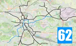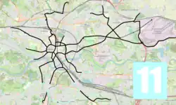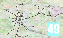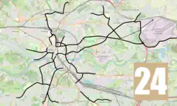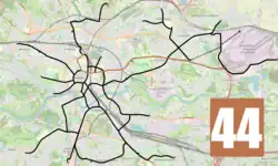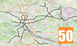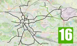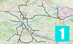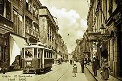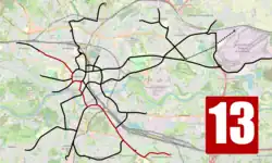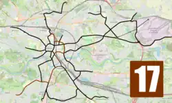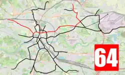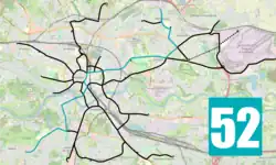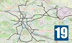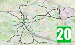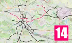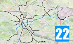 The Kraków tram system is a tram system in Kraków, Poland. The tramway has been in operation since 1882, and is currently operated by Miejskie Przedsiębiorstwo Komunikacyjne w Krakowie (MPK Kraków). There are 22 ordinary, 2 fast, and 3 night tram lines with a total line length of 347 kilometres (216 mi). As of 2013, the total route length of the tramway was 90 kilometres (56 mi), including a 1.4-kilometre (0.87 mi) tram tunnel with two underground stops.[1]
