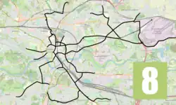 The fleet of N8 trams consists of 12 trams in total. Four ex-Nuremberg N8S-NF trams were built by MAN and Duewag in 1976 and 1977, and were retrofitted with low-floor sections in 1992 and 1993.[6] Seven ex-Nuremberg N8C-NF trams were built by MAN and Düwag in 1976 and 1977, and were retrofitted with low-floor sections in 1992 and 1993. They were refurbished by MPK Kraków and received chopper control.[6] One ex-Essen N8S-NF tram was built in 1975. It was refurbished by Protram and retrofitted with a low-floor section.[6] The ex-Essen unit is a former metre-gauge M8S, bought initially for replacement parts, but later adapted to standard gauge.[15][16] During the modernisation, they received an electronic passenger information system.