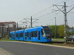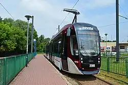 These trams (although manufactured by a different company) are structurally similar to the Bombardier NGT8 wagons and consist of 3 sections and are 33.4 m long. Two vehicles are equipped with lithium-ion traction batteries allowing operation without overhead lines, and the remaining wagons will have the option of installing such batteries.[6] Stadler Lajkonik is from the Stadler Tango Family and was designed by a Stadler Rail and Solaris Bus & Coach Consortium, but shortly after the contract was awarded, Stadler acquired the tram division of Solaris.[19]