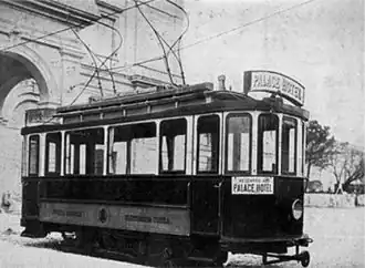 Eight twin axle electrically powered tramcars were acquired for the network from the Savigiano engineering company, and fitted out appropriately. They were 7.9 m (26 ft) long and 2 m (6.6 ft) wide, with 24 seats. Six of the eight are described as incorporating a baggage trunk (Con bagagliaio laterale). Each tramcar was powered by two 26 kW Siemens motors. One of the eight tramcars was reserved for the exclusive use of the city's "Hotel Palace".[1]