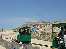 Trains are operated by open-sided coaches hauled by diesel locomotives, and the line is largely situated along the road side.[1][2] At the beach terminus, remains of the Atlantic Wall can be seen.