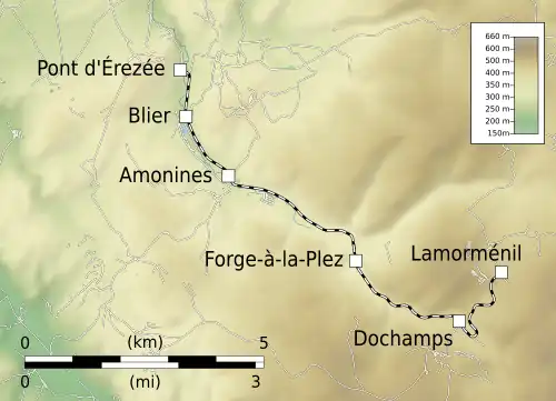 The line is the oldest and longest tramway in the province of Luxembourg, between Érezée and Dochamps. It is a 1,000 mm (3 ft 3+38 in) gauge line along the Aisne river.