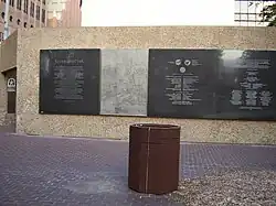 Tranquillity Park is a park located in Downtown Houston, Texas, between Walker and Rusk Streets, and west of Smith Street, with the United States federal courts building for the Southern District of Texas on one side and Houston City Hall on the other. It takes its name, notably differing in spelling, from the Sea of Tranquility, where man first landed on the Moon during the Apollo 11 mission on July 20, 1969.[1] First opening to visitors in the summer of 1979, Tranquillity Park was officially dedicated on the tenth anniversary of the historic lunar landing. On bronze plaques placed along the main entrance, the first words transmitted by Neil Armstrong from the Moon, "Houston, Tranquility Base here. The Eagle has landed," are written in 15 languages.[2] A replica of one of the footprints left on the Moon by Neil Armstrong is also on display inside the park.