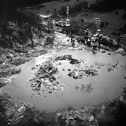 The aircraft plunged into a soggy field in Sainte-Thérèse, Quebec, about 100 metres (300 ft) from the main highway that leads to the Laurentian Mountains. One witness said that he saw what looked like "a long red streak in the sky" just before the crash.[6] The red-trimmed, silver jet dug a crater 2 metres (6 ft) deep and 50 metres (150 ft) wide in the ground that soon began to fill with rainwater.[7] Although parts of the airplane were scattered over a wide area ahead of and separate from the crater, the commission of inquiry found that the aircraft was structurally intact when it struck the ground.[8]