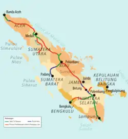The Trans-Sumatra Toll Road is an under-construction tolled expressway stretching across Sumatra Island in Indonesia from the northern tip of Banda Aceh to the southern tip of Bakauheni. This toll road was originally planned to connect to the established toll road system of Java through the now cancelled Sunda Strait Bridge.[1] The toll road is to include supporting corridors connecting the cities of Padang,[2] Bengkulu,[3] and Sibolga[4] on the western coast of the island to the main corridors stretching across the more populated eastern coast. State construction company Hutama Karya[a] has been given a government-granted monopoly to operate the network.