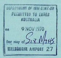 Prior to 1 September 1994, Australia generally treated New Zealanders as exempt non-citizens. Since 1 September 1994 Australia has had a universal visa requirement.[16] To specifically cater for the continued free movement of New Zealanders to Australia, the Special Category Visa was also introduced on 1 September 1994 by the Migration Regulations 1994. It is known as a subclass 444 visa. Under the 1994 regulations New Zealand citizens entering Australia are treated as having applied for a temporary entry visa, which is automatically granted (subject to health and character considerations) and recorded electronically. Unlike other nationals, there is no requirement to obtain a visa prior to arrival. And unlike other temporary visas, this particular visa – known as Special Category Visa (SCV) subclass 444 – has no time limit for New Zealand citizens. A date stamp in their passport on arrival is all that New Zealand citizens would observe on entry to Australia. For ePassport holders who use SmartGate, there is no date stamp.[16]