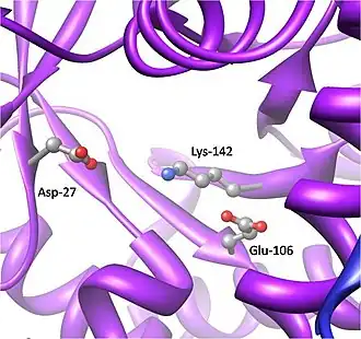 Active site of the transaldolase enzyme highlighting the key amino acid residues (Asp-27, Glu-106, and Lys-142) involved in catalysis.[1]