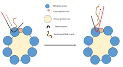 Transcription factories, in genetics describe the discrete sites where transcription occurs in the cell nucleus, and are an example of a biomolecular condensate. They were first discovered in 1993 and have been found to have structures analogous to replication factories, sites where replication also occurs in discrete sites. The factories contain an RNA polymerase (active or inactive) and the necessary transcription factors (activators and repressors) for transcription.[1] Transcription factories containing RNA polymerase II are the most studied but factories can exist for RNA polymerase I and III; the nucleolus being seen as the prototype for transcription factories. It is possible to view them under both light and electron microscopy.[2] The discovery of transcription factories has challenged the original view of how RNA polymerase interacts with the DNA polymer and it is thought that the presence of factories has important effects on gene regulation and nuclear structure.