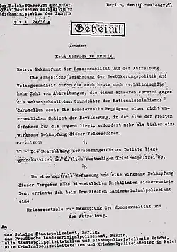 On 10 October 1936, the Reichszentrale zur Bekämpfung der Homosexualität und der Abtreibung (Reich Central Office for the Combating of Homosexuality and Abortion) was created by decree of Heinrich Himmler to establish guidelines on prosecuting homosexuality, and coordinating the prosecution of transgender people was generally also considered within its jurisdiction.[7] However, the Gestapo's homosexuality department also retained some authority on the area of transgender people as well. Specifically, the Reich Central Office for the Combating of Homosexuality and Abortion designated responsible by the Nazi government for "collaborating in the design of the security police's treatment of sexual degenerates", such as "transvestites, fetishists, and others."[7]