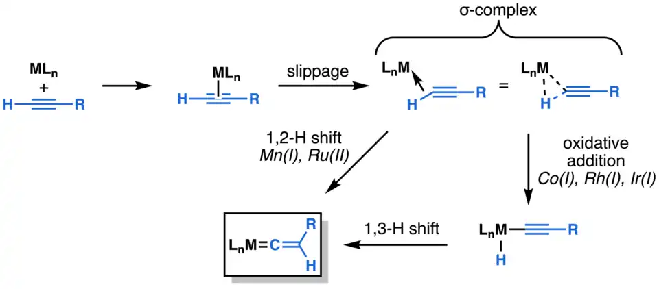 The mechanism of the isomerization process begins with formation of a metal-alkyne complex. It is proposed that "slippage" converts this species to a transient σ complex involving binding of the metal to the C–H bond.[7] For metals with a d6 electron count, such as Mn(I) or Ru(II), a subsequent 1,2-H shift gives the vinylidene complex.[8][9] For some electron-rich transition metals, such as Co(I), Rh(I), or Ir(I), oxidative addition of the C-H bong give a σ-alkynyl-hydrido metal complex. A subsequent 1,3-H shift (which also reduces the metal center to its starting oxidation state) then gives the transition metal vinylidene complex.