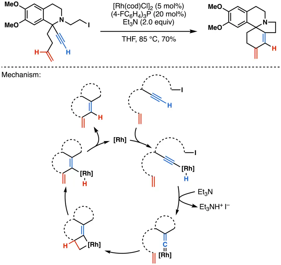 In the synthesis of 3-demethoxyerythratidinone, the angularly fused 6-5-6 A/B/C ring system was constructed using a tandem rhodium-catalyzed alkylation/cycloisomerization. The mechanism of this cascade sequence,[16] starts with formation of the σ-alkynyl hydrido rhodium complex. In the presence of a pendent alkyl iodide and triethylamine as a base, the alkynyl rhodium undergoes β-alkylation and deprotonation to give a rhodium vinylidene. Subsequently, the Rh=Cα bond undergoes [2+2] cycloaddition to the pendent alkene. The formed metallacyclobutene then undergoes β-hydride elimination and reductive elimination to give the final product.