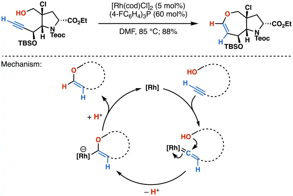- ^ Joo, Jung Min; Yuan, Yu; Lee, Chulbom (2006-11-01). "Tandem Cyclization of Alkynes via Rhodium Alkynyl and Alkenylidene Catalysis". Journal of the American Chemical Society. 128 (46): 14818–14819. Bibcode:2006JAChS.12814818J. doi:10.1021/ja066374v. ISSN 0002-7863. PMC 1762102. PMID 17105287.