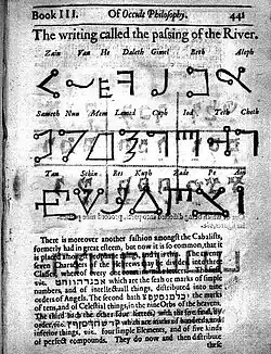 Transitus Fluvii ("passing through the river" in Latin) or Passage Du Fleuve (in French) is an occult alphabet consisting of 22 characters described by Heinrich Cornelius Agrippa in his Third Book of Occult Philosophy (Cologne, 1533, but written around 1510). It is derived from the Hebrew alphabet[1] and is similar to the Celestial and Malachim alphabets. The name may refer to the crossing of the Euphrates by the Jews on their return from the Babylonian captivity to rebuild the Temple in Jerusalem.[2]