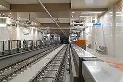In 1998 the first six kilometres of an often-interrupted 52 km standard gauge subway project (the Sofia Metro) opened in Sofia.[12] Additional stations were later built, and in 2012 a second line opened.[20] By April 2015 the total length was 36 km with 31 stations and Line 2 serving Sofia Airport. In 2016 the expansion of the network continued, as construction works on the third line commenced, and the system reached a total length of 40 km, with 35 stations along its two lines.[21] In 2021, the metro was expanded to 52 km total length with 47 stations on 4 lines. Further expansions are expected in the period 2021–2027.[22]