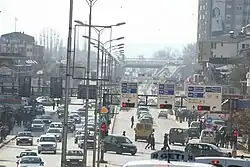 Roads in Pristina were in bad condition after the Kosovo War, forcing government investment to improve them. Today, all roads that connect the major villages with the urban centre are asphalted.[2] Roads that connect Pristina with other cities form the main routes of Kosovo's network. The M2, which starts from the north with Central Serbia, passes through Pristina and reaches the southern border with North Macedonia, shortly linking Pristina with the Pan European Corridor X. The M25 starts in Niš and passes through Pristina and Prizren, eventually reaching the border with Albania. This road is becoming more important for its south branch, linking Kosovo with Albania, where construction of the Rrëshen – Blinisht – Kukës road is ongoing. The M9 passes through the east administrative line with Central Serbia, through Pristina to Peja to the border with Montenegro.[3]